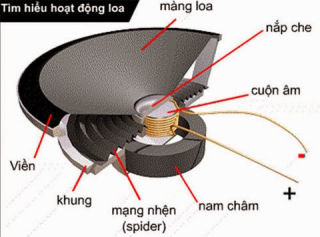 – Cuộn âm gắn với khung kim loại bằng mạng nhện (spider) vốn cũng là một vành tròn bằng vật liệu co giãn với nhiệm vụ giữ cho cuộn âm luôn ở đúng vị trí chính giữa nhưng vẫn cho phép cuộn này chuyển động vào ra.